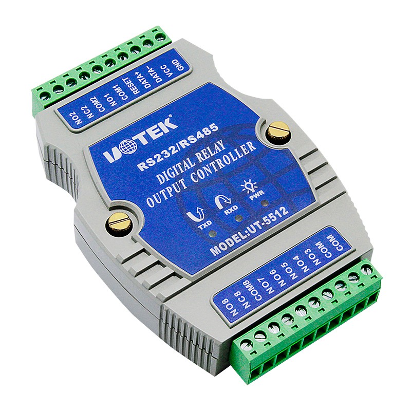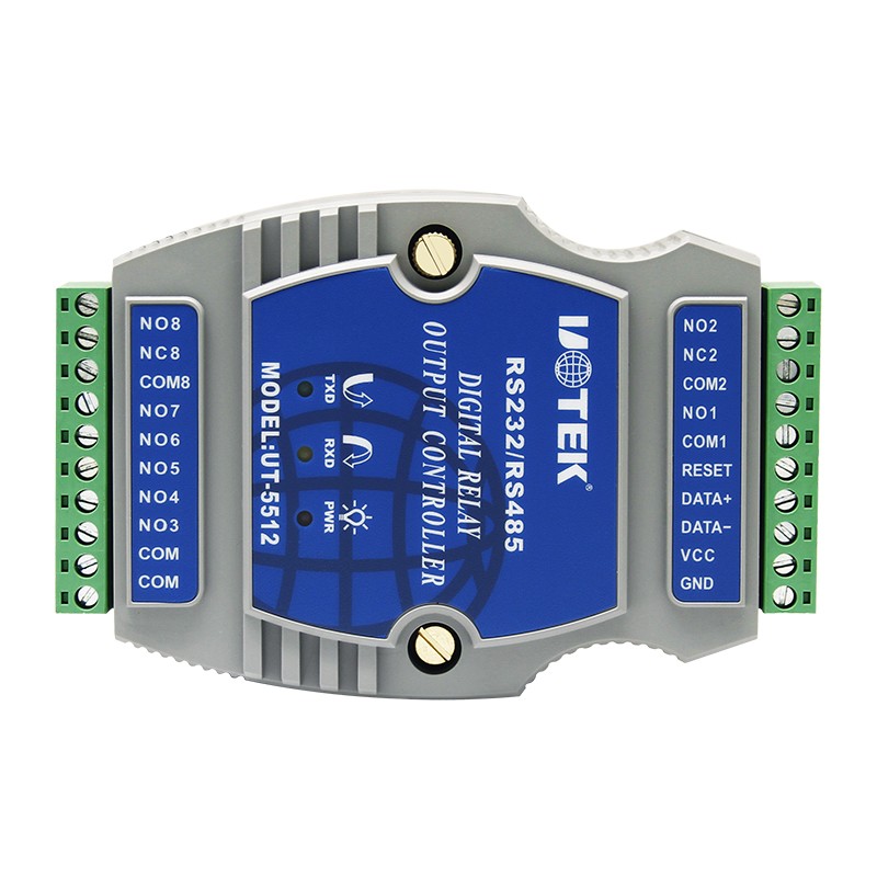 UT-5512是8通道繼電器輸出控制器,采用外置的RS-232/485光電隔離通信接口,非常容易地使用程序來控制那些輸出口的功能,再加上簡單的驅動線路來驅動外部的設備(例如: 氣動元件,外部繼電器開關,電眼狀態,遙控接口儀器,模數數模轉換器,步進電機控制等等)。
